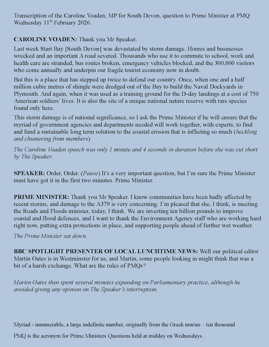 Heavy weather at the end of January and early February 2026 caused considerable damage to the shingle ridge near Torcross. The A379 road along the top of the ridge was breached and there was the risk that further wave action would erode the rest of the shingle and cause the Freshwater Ley to drain seaward at the next Low Water. Many buildings in Torcross were severely battered and flooded with sea water. Placing on record The following letter has been sent to the BBC in Plymouth who have demonstrated diligence in recording physical events and views of the population over many years.